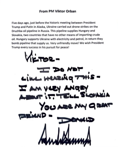 特朗普在欧尔班的信件内容下方手写回信。图源:匈牙利执政党青民盟社交媒体脸书账号
